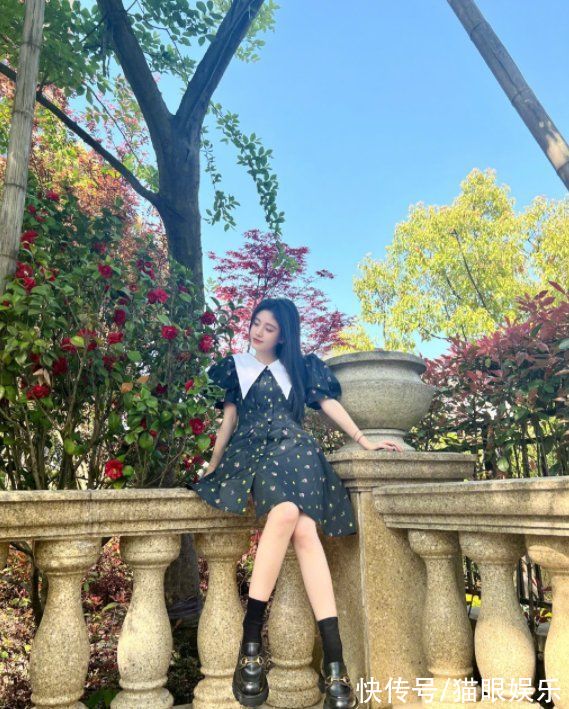 照片中一张坐在围栏上的图,全身白皙、四肢纤细,小腿甚至和胳膊差不多粗,挑不出任何的缺点。